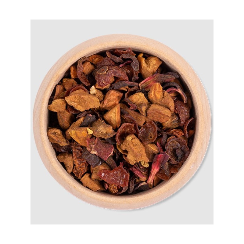 Zutaten: Apfel, Hagebutte, Hibiskus, Süßholzwurzel, Lakritzpulver, Aroma. Enthält Süßholz - bei hohem Blutdruck sollte ein übermäßiger Verzehr vermieden werden.
