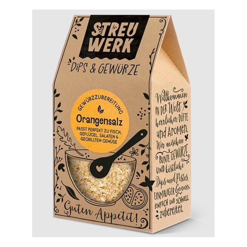 „Orangensalz“ ist eine Gewürzsalzmischung mit 47 % Orangenschalenanteil, Steinsalz und Fleur de Sel. Die Mischung sorgt für eine zitronige Geschmacksnote und kann Fisch, Geflügel sowie Salate geschmacklich ergänzen. Ebenso kann Orangensalz zur Abrundung von Desserts oder Cocktails verwendet werden, um diesen ein fruchtiges Aroma zu geben.